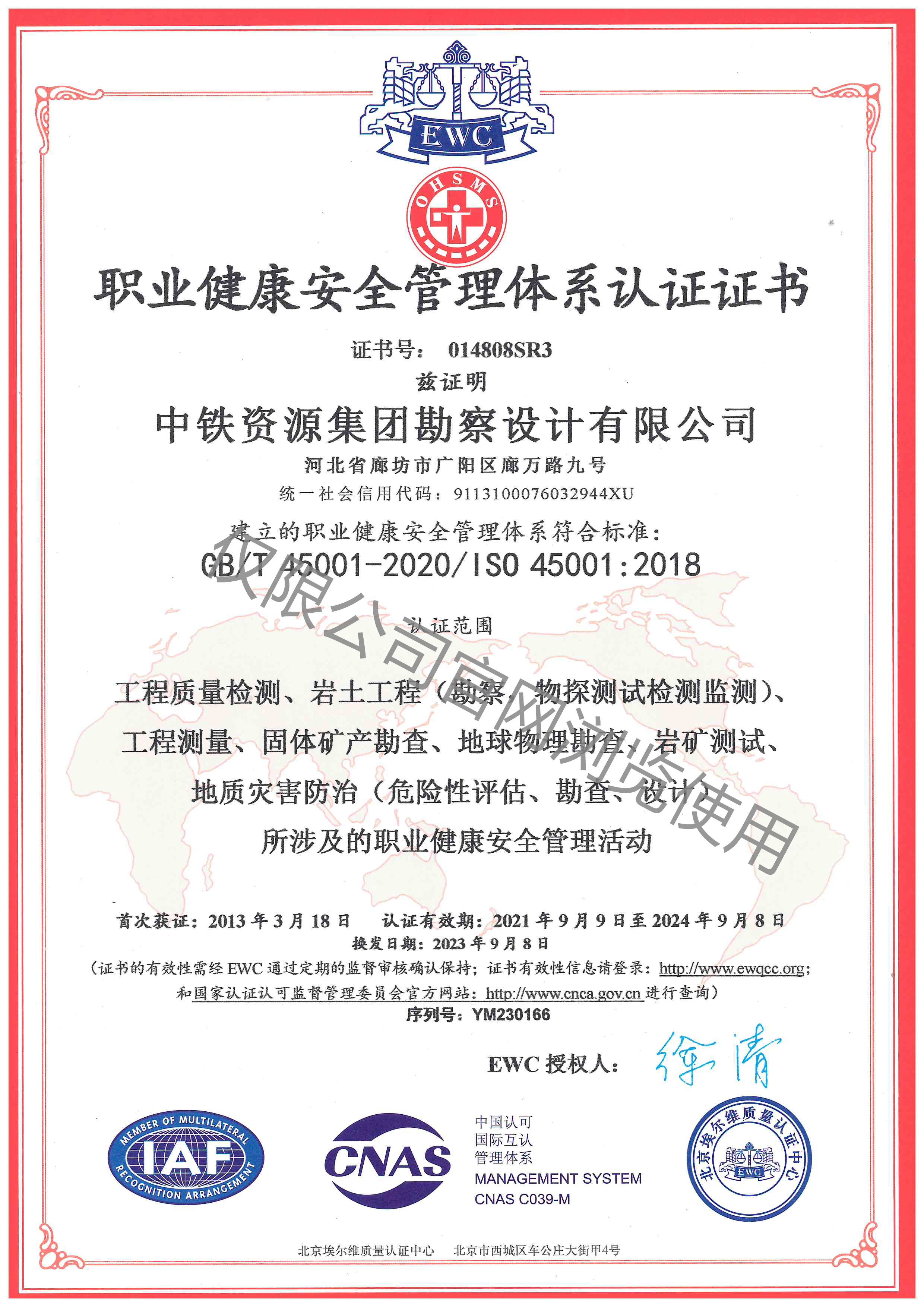 職業(yè)健康安全管理體系認證證書